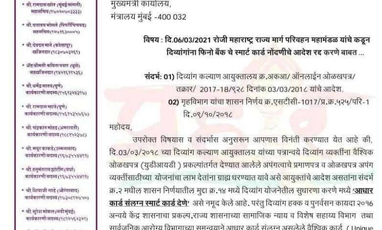 अमळनेर : दिव्यांगांना महाराष्ट्र राज्य मार्ग परिवहन महामंडळ यांनी दिनांक ६ मार्च २०२१ रोजी युनिक (UDID) कार्ड वरून जेष्ठ नागरिकांना देण्यात येणारे स्मार्ट कार्ड सारखे कार्ड दिव्यांगांना देण्यात येणार आहे व त्यांची नोंदणी देखील चालू करण्यात आली आहे असे आदेश काढण्यात आले आहेत परंतु दि.९ ऑक्टोबर २०१८ च्या शासन निर्णयानुसार आधार कार्ड संलग्न स्मार्ट कार्ड देने असा शासन निर्णय असून देखील एस टी महामंडळ यांच्या कडून आदेश काढण्यात आले आहेत.