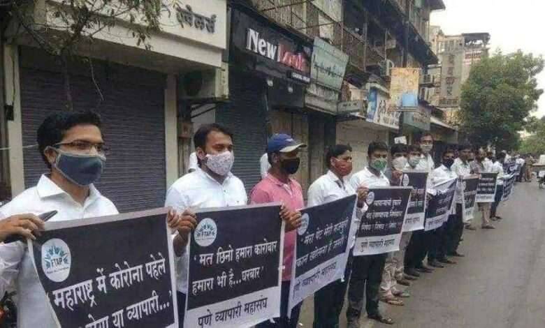 ? मोठी बातमी..” कोरोना से मारेंगे कम , लॉक डाऊन से मारेंगे हम “, पुण्यात व्यापाऱ्याचे मानवी साखळी आंदोलन