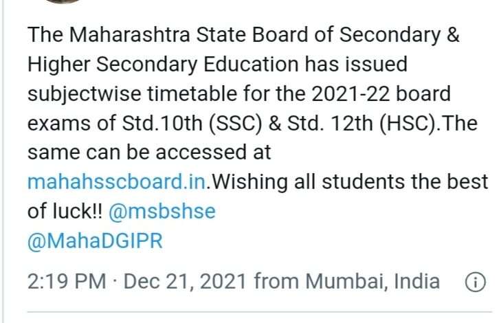 उच्च माध्यमिक शाळा प्रमाणपत्र (HSC) आणि माध्यमिक शाळा प्रमाणपत्र (SSC) बोर्ड परीक्षांचे वेळापत्रक जाहीर झाले आहे. राज्याच्या शिक्षणमंत्री वर्षा गायकवाड यांनी ट्वीट करत याबाबतची माहिती दिली आहे.