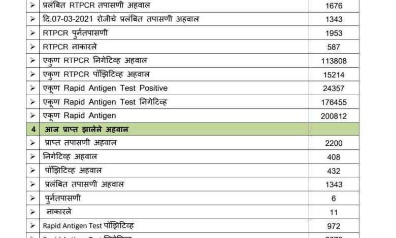 रुग्णांचा मृत्यू झाला असून उपचार घेऊन बरे झालेल्या रुग्णांची संख्या 31410 आहे. आज बरे झालेल्या रुग्णांची संख्या 523 आहे. आरटिपीसीआर मधील 1343 अहवाल प्रलंबित आहेत.