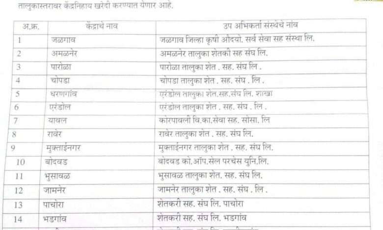 जळगाव, दि. 15 :- जिल्ह्यात खरीप पणन हंगाम 2019-20 मध्ये केंद्र शासनाच्या आधारभूत किंमत खरेदी योजने अंतर्गत भरडधान्य (ज्वारी, बाजरी व मका) खरेदीकरीता जिल्हाधिकारी डाॅ. अविनाश ढाकणे यांनी बिगर आदिवासी क्षेत्रात 15 खरेदी केंद्रांना मंजुरी दिलेली आहे. सदरच्या खरेदी केंद्रावर शेतकऱ्यांनी खरेदीसाठी ऑनलाईन नोंद करावयाची आहे.