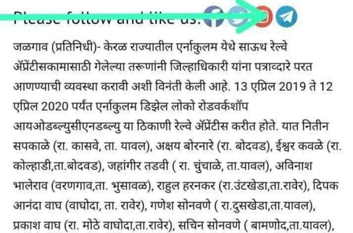 जळगाव जिल्ह्यातील यावल बोदवड भुसावळ रावेर व जळगाव या तालुक्यातील 15 तरुण विद्यार्थी केरळ राज्यातील एर्नाकुलम येथे साउथ रेल्वे अप्रेंटिस शिक्षणाकरिता दिनांक 13 एप्रिल 2019 ते 12 एप्रिल 2020 ह्या कालावधीपर्यंत केरळ राज्यामधील एरनाकुलम डिझेल लोको रोड वर्कशॉप आय डब्ल्यू सीएन डब्ल्यू याठिकाणी रेल्वे अप्रेंटिस करिता गेलेले आहेत.