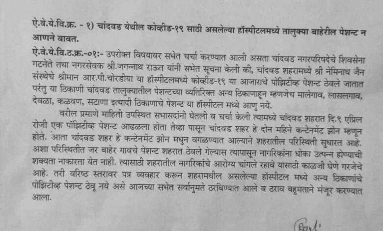 चांदवड नगरपरिषद नगरसेवकांनी सुद्धा अश्या आशयाचा एक ठराव केला आहे व त्यात म्हटले आहे की चांदवड तालुक्याच्या व्यतिरिक्त अन्य ठिकाण मालेगाव,देवळा,लासलगाव,सटाणा येथील पेशंट चांदवड कोविड सेंटर मध्ये आणू नये