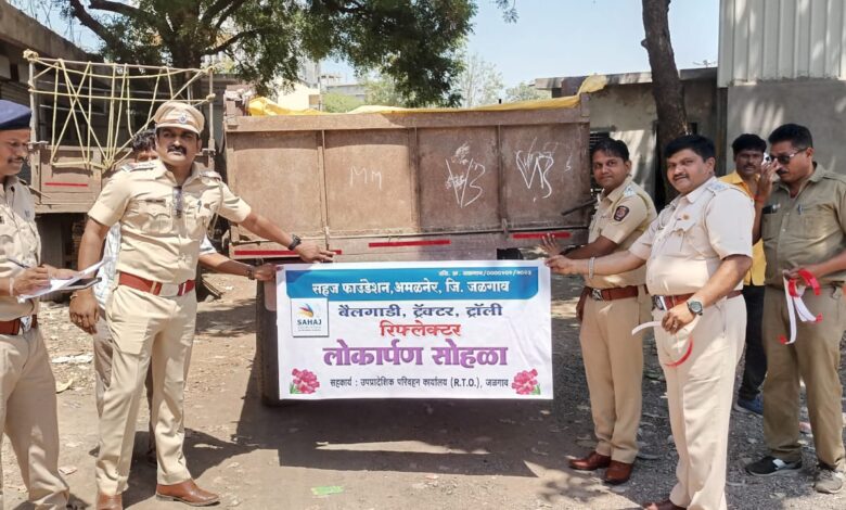Amalner: १६५ ट्रॅक्टर ट्रॉलींना रिफ्लेक्टर लावून मानवी जीवन केले सुरक्षित…डीवायएसपी राकेश जाधव यांची संकल्पना : सहज फाउंडेशन व आरटीओ जळगावचा उपक्रम
