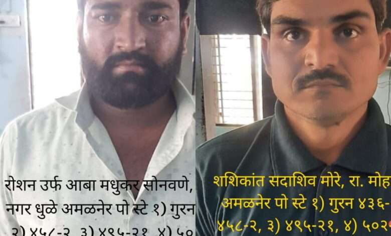 प्रमाणे ६) रोशन उर्फे आबा मधुकर सोनवणे, रा. अंबिकानगर, (१) धुळे तालुका पो.स्टे. गुरनं १३३/२०१३, (२) धुळे शहर पो.स्टे. गुरनं ७९/२०१२, (३) आजादनगर पो.स्टे. गुरनं १०५/२०११, (४) गुरनं १५६/२०१४ (५) गुरनं २५०/२०१४, (६) चाळीसगांव रोड पो.स्टे. गुरनं १९०/२०१४, (७) गुरनं ३२/२०१९ (८) पिसोर