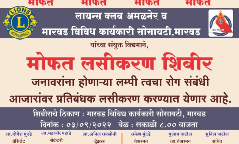 लायन्स क्लब अमळनेर व मारवड विविध कार्यकारी सोसायटीच्या संयुक्त विद्यमाने मारवड येथे जनावरांच्या लम्पी या आजाराचे मोफत लसीकरण शिबीर आयोजित करण्यात आलेले आहे.हे शिबिर ३ सप्टेंबर,शनिवार रोजी सकाळी ८ वाजेपासून मारवड वि.का.सोसायटी संकुल आवारात होणार आहे.