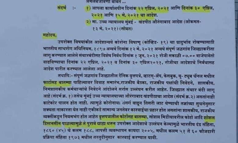 तथापि:- संपूर्ण जळगांव जिल्ह्यातील दैनिक वृत्तपत्रे, व्हाटस्-अॅप, फेसबुक, यू-ट्यूब चॅनल मधील फाटोंसह बातम्या पाहिल्यावर विवाह समारंभ,राजकीय बैठका, राजकीय पक्षांची निवेदने, शासकीय, निमशासकीय कर्मचाऱ्यांचे निवेदने आंदोलने सर्रास उल्लंघन करीत आहेत. जिल्ह्यात संचार बंदी लागू आहे (संदर्भ क्र. १) तसेच मुंबई उच्च न्यायालयाच्या औरंगाबाद खंडपीठाचा आदेश (संदर्भ क्र.२) असतांनाही