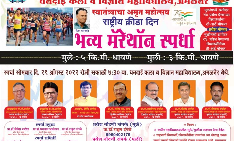 अमळनेर: () राष्ट्रीय क्रीडा दिनानिमित्त २९ ऑगष्ट रोजी धनदाई कला व विज्ञान महाविद्यालय, अमळनेर येथे स्वातंत्र्याचा अमृत महोत्सव या उपक्रमांतर्गत भव्य मॅरेथॉन स्पर्धेचे आयोजन करण्यात येणार आहे. विजयी प्रथम तिन स्पर्धकांना रोख रक्कम, ट्रॉफी व प्रमाणपत्र तर सर्व सहभागींना सहभाग प्रमाणपत्र देण्यात येणार आहे.
