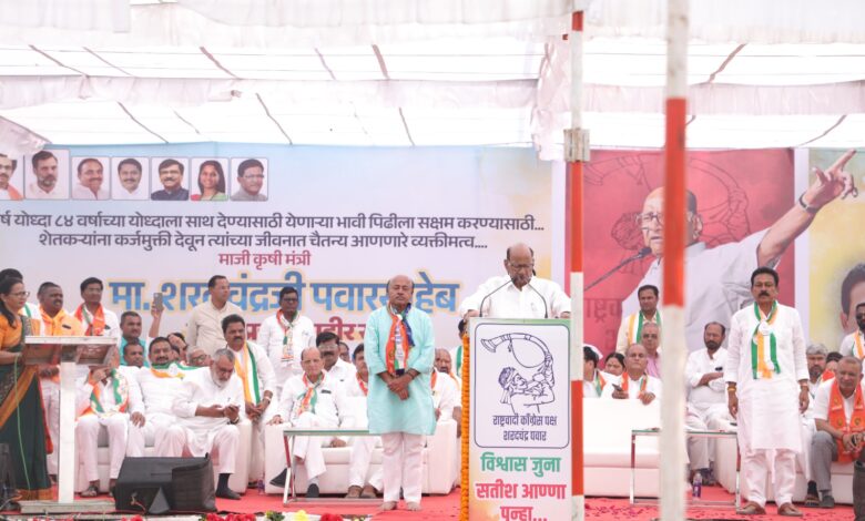 आज पारोळा येथे माजी केंद्रीय मंत्री मा.शरदचंद्र पवार यांची सभा आयोजित करण्यात आली होती. या सभेत शरद पवार म्हणाले की, महाविकास आघाडीचे उमेदवार डॉ अनिल शिंदे यांची निशाणी हाताचा पंजा आहे. डॉ अनिल शिंदे यांना मोठ्या मतांनी विजयी करा अशी शरद पवार यांनी विनंती केली,आपल्या भाषणात सांगितले की, महाराष्ट्र मध्ये नऊशे शेतकरी आत्महत्या झाली आहेत. शेतमालाला भाव मिळत नाही, या महाराष्ट्रात शेतकरी आत्महत्या का करतो ? तरूणांना नोकऱ्या नाहीत, असा सवाल शरदचंद्रजी पवार यांनी उपस्थित केला,या देशात महिलांवर अत्याचार केला जातो.लहान मुले वर अत्याचार केले जाते.शेतकरी कर्ज बाजारी आहे अशी अवस्था आपल्या महाराष्ट्राची झालेली आहे.