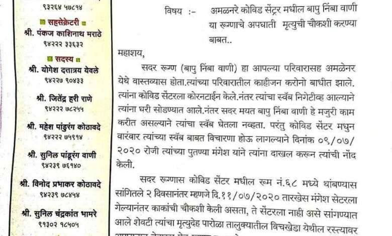 अमळनेर – येथील कोविड सेंटरमधून बेपत्ता झालेल्या बापू निंबा वाणी या रुग्णाच्या अपघाती मृत्युची चौकशी करण्यात यावी, अशी मागणी लाडशाखीय वाणी समाजातर्फे जिल्हाधिकाऱ्यांकडे करण्यात आली आहे.नूरखानजिल्हाधिकारी यांना दिलेल्या निवेदनात म्हटले आहे की, बापू निंबा वाणी हे वृद्ध आपल्या परिवारासह अमळनेर येथे वास्तव्यास होते. त्यांच्या परिवारातील काहीजन करोनो बाधीत झाले. त्यांना कोविड सेंटरला कोरनटाईन केले. नंतर त्यांचा स्वॅब निगेटीव्ह आल्याने त्यांना घरी सोडण्यात आले. नंतर त्यांच्या संपर्कात आलेले बापू वाणी हे मजुरी काम करीत असल्याने त्यांचा स्वॅब घेतला नव्हता. परंतु कोविड सेंटर मधुनअमळनेर येथील कोविड सेंटरमधून बेपत्ता झालेल्या बापू निंबा वाणी या रुग्णाच्या अपघाती मृत्युची चौकशी करण्यात यावी, अशी मागणी लाडशाखीय वाणी समाजातर्फे जिल्हाधिकाऱ्यांकडे करण्यात आली आहे.वारंवार त्यांच्या स्वॅब बाबत विचारणा होऊ लागल्याने दिनांक ९ जुलै रोजी त्यांचा पुतण्या मंगेश यांने त्यांना दाखल करून त्यांची नोंद केली. त्यानुसार बापू वाणी यांना कोविड सेंटर मधील रूम नं.६८ मध्ये थांबण्यास सांगितले. मात्र २ दिवसानंतर म्हणजे दि.११ जुलै रोजी मंगेश हे सेंटरला गेल्यानंतर काकांची चौकशी केली असता, ते सेंटरला नाही असे सांगण्यात आले. शेवटी त्यांचा मृत्युदेह पारोळा तालुक्यातील विचखेडा येथील रस्त्यावर अपघातात बेवारस प्रेत म्हणून सापडले. या घटनेस प्रशासन जबाबदार असून या संदर्भात योग्य ती चौकशी व्हावी व मयत बापू वाणी व त्यांच्या परिवारास योग्य तो न्याय मिळावा, अशी मागणी लाडशाखीय वाणी समाजातर्फे स्वाती राजेश कोठावदे, पंकज काशिनाथ मराठे, योगेश दत्तात्रय येवले, जितेंद्र हरी राणे, महेश पांडूरंग कोठावदे, सुनिल पांडूरंग वाणी, विनोंद प्रभाकर कोठावदे, सुनिल चंद्रकांत भामरे यांनी केली आहे. दरम्यान, निवेदनाच्या प्रति माजी आमदार स्मिता उदय वाघ आणि खासदार