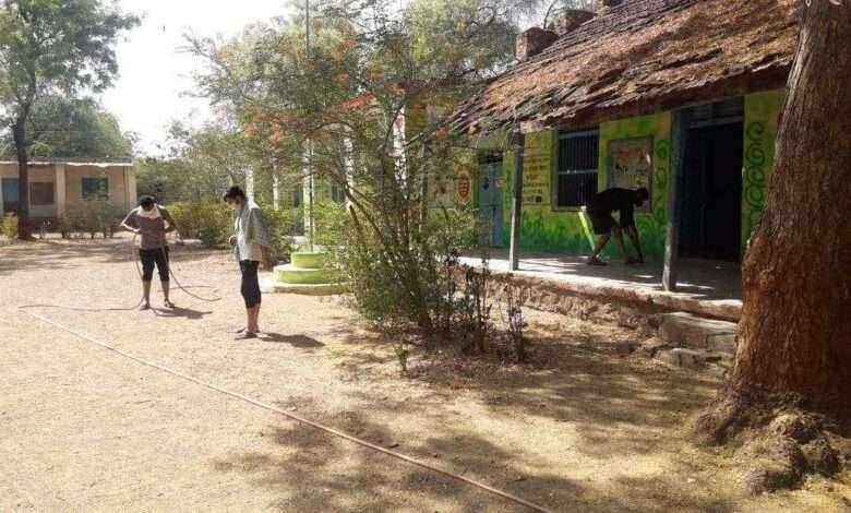 रिकाम्या वेळेत करत आहेत शाळेची साफसफाई व रोपांची देखभाल….