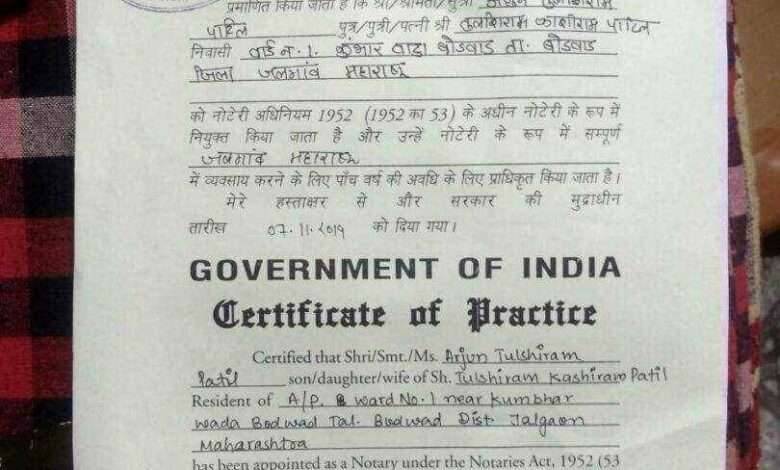 एडवोकेट अर्जुन तुळशीराम पाटील यांना नुकतीच भारत सरकार नवी दिल्ली मार्फत नोटरी पदी नियुक्ती करण्यात आली असल्याचे नियुक्तीपत्र त्यांना नुकतेच मिळाले आहे .