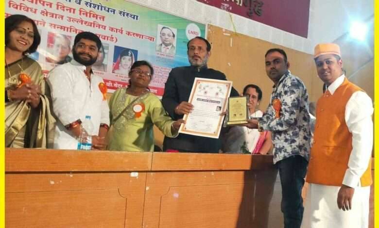 औरंगाबाद : औरंगाबाद येथील लोक निर्माण ग्रामीण विकास व संशोधन संस्था औरंगाबाद यांच्या तर्फे सु- लक्ष्मी सेवाभावी संस्था व त्यांचे सदस्य वाघोदा येथील सामाजिक कार्यकर्ते कमलाकर माळी यांना मौलाना आझाद रिसर्च सेंटर येथील सभागृहात राष्ट्रीय गौरव पुरस्कार मान्यवरांच्या हस्ते प्रदान करण्यात आला.लोक निर्माण ग्रामीण विकास व संशोधन संस्था यांच्या २२ व्या वर्धापनदिनाच्या निमित्ताने राष्ट्रीय गौरव पुरस्काराचे आयोजन करण्यात आले होते.पुरस्काराचे स्वरूप शाल श्रीफळ व सन्मानचिन्ह प्रशस्तीपत्र असे होते.हा पुरस्कार सोहळा दिनांक ३ फेब्रुवारी २०२१ रोजी औरंगाबाद येथे मौलाना आझाद रिसर्च सेंटर येथे साजरा करण्यात आला.या कार्यक्रमासाठी प्रमुख अतिथी म्हणून माजी मंत्री अतुल सावे,पोलीस उपनिरीक्षक दिलिप जाधव डॉक्टर प्रमोद वाचस्पति राष्ट्रीय अध्यक्ष आदि उपस्थित होते.व कार्यक्रमाचे आयोजक संस्थेच्या अध्यक्षा अर्चना मेडेवार व सचीव सिमा गुंडेळे यादिंनी परीश्रम घेतले, ह्या पुरस्कार मिळाल्याने कमलाकर माळी यांचे सर्वच स्तरातून कौतुक होत आहे.