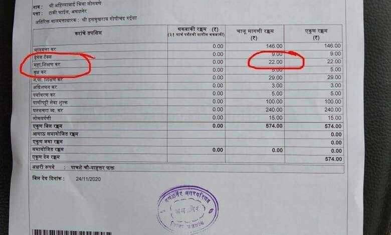 अमळनेर नगरपरिषदेकडून नागरिकांची फसवणूक केली जात असल्याची पुराव्यासह माहिती मिळाली आहे. अमळनेर नगरपरिषदेच्या घर टॅक्स पावतीत महा शिक्षण कराचा उल्लेख केलेला आहे.ह्या शिक्षण कराची रक्कम मला उपलब्ध झालेल्या घरपट्टी पावतीत 22/- रु इतकी आकारण्यात येत आहे.विशेष म्हणजे मालमत्ता कर हा वेगवेगळ्या ठिकाण,आणि कॉलनी परिसर या दृष्टीने वेग वेगळा आकारण्यात येतो.ह्या मालमता कराच्या टक्केवारी त हा शिक्षण कर आकारण्यात येत आहे. उदा 574 रु च्या मालमता करावर 22 रु याप्रमाणे..तर न पा शिक्षण कराची रक्कम 29 रु एव्हढी आहे..!दुसऱ्या एका कर पावतीत 4710 रु च्या मालमता करावर महा शिक्षण कर 565/रु तर न पा शिक्षण कर 509 रु एव्हढा आकारण्यात आला आहे.
