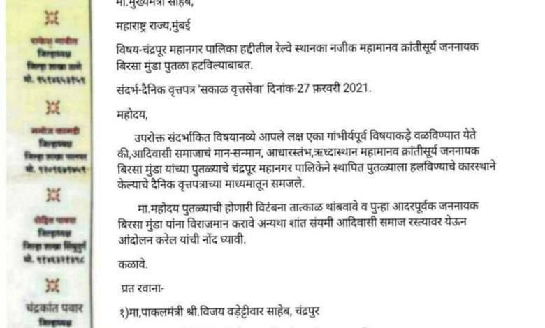 निवेदनात म्हटले आहे की,दैनिक वृत्तपत्र ‘सकाळ वृत्तसेवा’ दिनांक-27 फ़रवरी 2021 मधील बातमी नूसार आपले लक्ष एका गांभीर्यपूर्व विषयाकड़े वळविण्यात येते की,आदिवासी समाजाचं मान-सन्मान, आधारस्तंभ,ऋध्दास्थान महामानव क्रांतीसूर्य जननायक बिरसा मुंडा यांच्या पुतळ्याचे चंद्रपूर महानगर पालिकेने स्थापित पुतळ्याला हलविण्याचे कारस्थाने केल्याचे दैनिक वृत्तपत्राच्या माध्यमातून समजले.