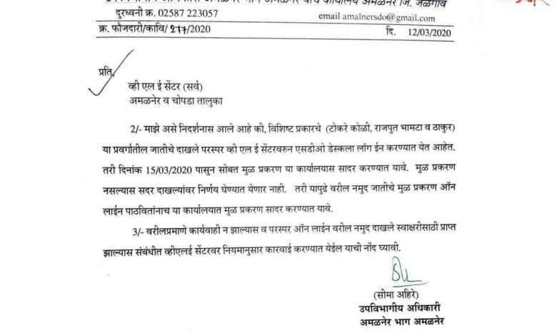अमळनेर येथील उपविभागीय अधिकारी कार्यालयातून एकाच व्ही एल ई सेंटर वरून सध्या अनेक दाखले मंजूर केले जात असल्याची चर्चा रंगली आहे.उपविभागीय कार्यालयाच्या परिसरात याबद्दल अनेक दिवसांपासून तक्रारीचा सूर निघत होता.उपविभागीय अधिकारी सिमा अहिरे यांनी दाखले परस्पर SDO डेस्कला लॉग इन करण्यात येत आहेत असे पत्र सर्व अमळनेर, चोपडा येथील व्ही एल ई सेंटरला दिले आहे. या पत्रा द्वारे काही सूचना सेतू सुविधा केंद्रांना देण्यात आल्या आहेत.