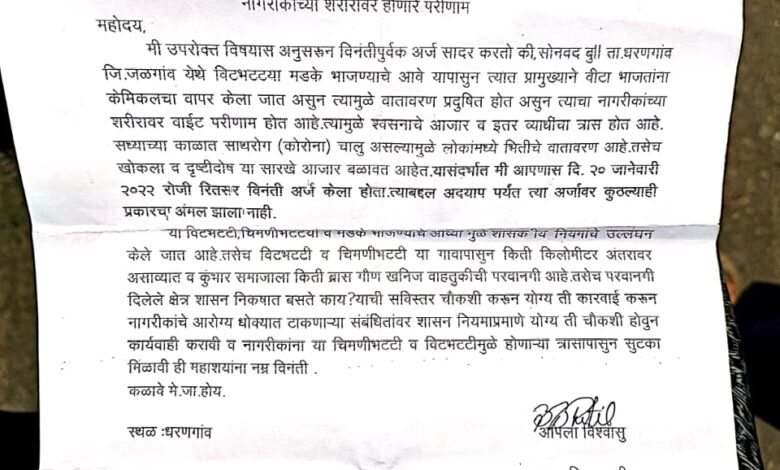 दिनांक:- 06/02/2023 वार सोमवार :- काय ते सोनवद, काय ते तेथील वीट भट्टी, काय ते तेथील केमिकल चे प्रदूषण सगळ ओके मंधी आहे धरणगाव तालुक्यातील सोनवद येथे विट भट्ट्या चालता तर येणाऱ्या जाणाऱ्या लोकांना व जवळ असलेल्या शेतात काम करणाऱ्या शेकऱ्यांना प्रचंड त्रास सहन करावा लागतो. शहर व परिसरात वीट पांरपारिक पद्धतीने बनविली जाते, मातीचे साचे बनवून ते एकमेकावर रचून भट्टी बनवली जाते व दगडी कोळशाचे यामध्ये इंधन म्हणून उपयोग करण्यात येतो. प्रदूषण नियंत्रक मंडळानुसार, इंधन म्हणून वापरात येणाऱ्या दगडी कोळश्याच्या ज्वलनानंतर सल्फर डायऑक्साईड, कार्बन डायऑक्साईड, कार्बन मोनोऑक्साईड, आणि नायट्रोजन मधील ऑक्साईड या विषारी वायूंचे उत्सर्जन होते. या विषारी वायू मधील सल्फर डायऑक्साईडमूळे डोळ्याचे विविध विकार आणि हवेतील नायट्रोजन मधील डायऑक्साईड मूळे फुफ्फुसाचे व त्वचेचे आजार होतात, तसेच कार्बन मोनोऑक्साईड आणि कार्बन डायऑक्साईड या विषारी वायुमुळे वीट भट्ट्यांच्या परिसरातील तापमानात वाढ होवून सभोवतालच्या शेतीवर तसेच नागरिकांच्या आरोग्यावर विपरीत परिणाम होते. तेथील नागरिकांच्या सांगण्या नुसार विट भट्टीत प्रचंड प्रमाणात केमिकल चा वापर देखील केला जात आहे त्यामुळे तेथील नागरिकांचे जीव धोक्यात येत आहे सदर सोनवद येथील रहिवाशी शेतकरी भटा भिला पाटील यांनी 2021 व 2022 मध्ये प्रशासनाला वारंवार अर्ज दिले होते परंतु त्यांच्या माहिती नुसार त्यांनी वारंवार अर्ज देऊन सुद्धा अद्याप कोणत्याही अधिकाऱ्याने कुठली ही कार्यवाही किंवा चौकशी केली नाही सरकारी नियमानुसार एकावेळी ५० हजारापेक्षा कमी विटांची निर्मिती करत असल्यास त्यांना महाराष्ट्र प्रदूषण नियंत्रण मंडळाचे संमतिपत्र बंधनकारक नसेल. मात्र ५० हजारापेक्षा जास्त वीट निर्मिती करत असतील तर अशा वीट भट्टीधारकांना महाराष्ट्र प्रदूषण नियंत्रण मंडळाचे संमतिपत्र बंधनकारक राहील. तसेच एकावेळी ५० हजारांची निर्मिती केल्यानंतर तीन दिवसांनंतरच दुसरी वीट भट्टी लावण्यात यावी. वीट भट्टीचे ठिकाण एक हजार लोकसंख्या असलेल्या वस्तीपासून आणि राष्ट्रीय व राज्य महामार्गापासून कमीत कमी २०० मीटर अंतराच्या पुढे असावे, असे पर्यावरण मंत्री रामदास कदम यांनी सांगितले आहे तरी देखील नियमांचे उल्लघन होताना दिसून येत आहे प्रदूषणाला व केमिकल ला कंटाळून नागरिकांनी योग्य ती कार्यवाही करण्याची प्रशासनाला विनंती केली आहे.