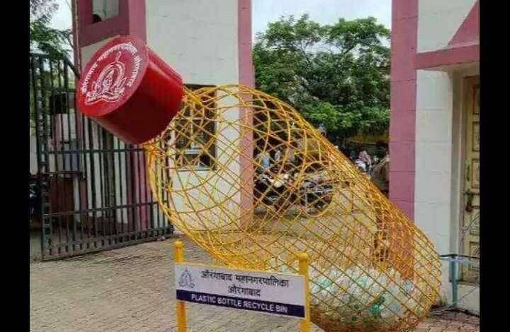 औरंगाबाद : मनपा कार्यालयात येणाऱ्या नागरिकांनी रिकाम्या प्लास्टिक बाटल्या इतरत्र न फेकता त्या प्लास्टिक बॉटल डस्टबीन मध्ये टाकाव्यात, सदरील प्रतीकात्मक डस्टबिन बॉटल महानगरपालिकेच्या प्रवेशद्वारासमोर लावण्यात आली आहे. महानगरपालिका आयुक्त तथा प्रशासक आस्तिक कुमार पाण्डेय यांच्या संकल्पनेतून साकारलेली ही बॉटल डस्टबीन नागरिकाचे लक्ष वेधून घेत आहे.