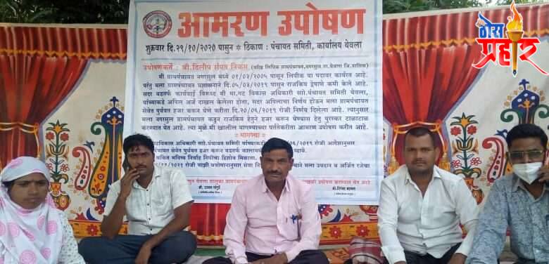 येवला तालुक्यातील नगरसुल ग्रामपंचायतीचे वरिष्ठ लिपिक कर्मचारी दिलीप संपत निकम हे नगरसुल ग्रामपंचायत मध्ये दिनांक 1/3 /2005 पासून लिपिक या पदावर कार्यरत असताना अचानक संबंधित ग्रामपंचायत सरपंच, ग्राम विकास अधिकारी यांनी दिलीप संपत निकम यांना बडतर्फ केल्याची ५/३/२०१९ रोजी नोटीस बजावली असता संबंधित नोटीस विरुद्ध माननीय गट विकास अधिकारी पंचायत समिती येवला यांच्याकडे दिलीप संपत निकम यांनी४/४/२०१९ रोजी दाद मागितली असता दिलीप निकम यांना पुन्हा सेवेत सामावून घेण्याचे आदेश गटविकास अधिकारी यांनी दिले परंतु संबंधित सरपंच ग्राम विकास अधिकारी यांनी या आदेशाला न जुमानता अद्यापही सेवेत सामावून घेतलेले नाही म्हणून दिलीप संपत निकम हे सेवेत सामावून घेण्यासाठी पंचायत समिती येवला येथे आमरण उपोषण करत असल्याचे त्यांनी स्पष्ट केले दिलीप संपत निकम हे ४/११/२०२१ रोजी शासनाच्या वय मर्यादेनुसार सेवानिवृत्ती होत असून ते सेवानिवृत्ती लाभापासून वंचित राहू नये व बडतर्फ कालावधी मधील वेतन मिळावे तसेच सेवानिवृत्तीनंतर उपदान अर्जित रजा लाभ मिळावा व सेवेत पूर्ववत सामावून घेण्यासाठी पंचायत समिती कार्यालय समोर आमरण उपोषण करत असून अद्यापही या उपोषणाची दखल कोणत्याच अधिकाऱ्यांनी घेतलेली नसल्याचे दिलीप संपत निकम यांनी सांगितले आहे संबंधित अधिकाऱ्यांनी याकडे दुर्लक्ष केले तरी न्यायव्यवस्थेवर संपुर्ण विश्वास असून न्याय मिळवण्यासाठी दिवाळीच्या सुट्टीचा कालावधी मध्ये आमरण उपोषण कायम ठेवले जाईल असे दिलीप संपत निकम यांनी सांगितले.