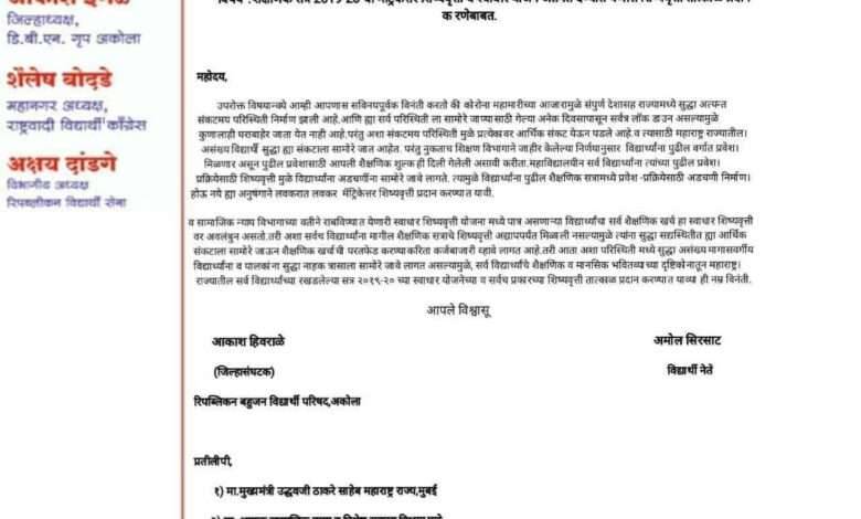 कोरोना महामारीच्या आजारामुळे संपुर्ण देशासह राज्यामध्ये सुद्धा अत्यन्त संकटमय परिस्थिती निर्माण झाली आहे.आणि ह्या सर्व परिस्थिती ला सामोरे जाण्यासाठी गेल्या अनेक दिवसापासून सर्वत्र लॉक डाउन असल्यामुळे कुणालाही घराबाहेर जाता येत नाही आहे.परंतु अशा संकटमय परिस्थिती मुळे प्रत्येकावर आर्थिक संकट येऊन पडले आहे.व त्यासाठी महाराष्ट्र राज्यातील असंख्य विद्यार्थी सुद्धा ह्या संकटाला सामोरे जात आहेत. परंतु नुकताच शिक्षण विभागाने जाहीर केलेल्या निर्णयानुसार विद्यार्थ्यांना पुढील वर्गात प्रवेश मिळणार असून पुढील प्रवेशासाठी आपली शैक्षणिक शुल्क ही दिली गेलेली असावी करीता.महाविद्यालयीन सर्व विद्यार्थ्यांना त्यांच्या पुढील प्रवेश प्रक्रियेसाठी शिष्यवृत्ती मुळे विद्यार्थ्यांना अडचणींना सामोरे जावे लागते. त्यामुळे विद्यार्थ्यांना पुढील शैक्षणिक सत्रामध्ये प्रवेश -प्रक्रियेसाठी अडचणी निर्माण होऊ नये ह्या अनुषंगाने लवकरात लवकर मॅट्रिकेत्तर शिष्यवृत्ती प्रदान करण्यात यावी व सामाजिक न्याय विभागाच्या वतीने राबविण्यात येणारी स्वाधार शिष्यवृत्ती योजना मध्ये पात्र असणाऱ्या विद्यार्थ्यांचा सर्व शैक्षणिक खर्च हा स्वाधार शिष्यवृत्ती वर अवलंबुन असतो.तरी अशा सर्वच विद्यार्थ्यांना मागील शैक्षणिक सत्राचे शिष्यवृत्ती अद्यापपर्यंत मिळाली नसल्यामुळे त्यांना सुद्धा सद्यस्थितीत ह्या आर्थिक संकटाला सामोरे जाऊन शैक्षणिक मागील वर्षाच्या शैक्षणिक खर्चाची परतफेड करण्याकरिता कर्जबाजारी व्हावे लागत आहे.तरी आता अशा परिस्थिती मध्ये सुद्धा असंख्य मागासवर्गीय विद्यार्थ्यांना व पालकांना सुद्धा नाहक त्रासाला सामोरे जावे लागत असल्यामुळे, सर्व विद्यार्थ्यांचे शैक्षणिक व मानसिक भवितव्याच्या दृष्टिकोनातून महाराष्ट्र राज्यातील सर्व विद्यार्थ्यांच्या रखडलेल्या सत्र २०१९-२० च्या स्वाधार योजनेच्या व सर्वच प्रकारच्या शिष्यवृत्ती तात्काळ प्रदान करण्यात याव्या अशी मागणी रिपब्लिकन बहुजन विद्यार्थी परिषद,अकोला चे जिल्हासंघटक आकाश हिवराळे व विद्यार्थी नेते अमोल सिरसाट ह्यांनी धनंजय मुंडे ह्यांना ई मेल द्वारे पत्र पाठवून केली आहे.