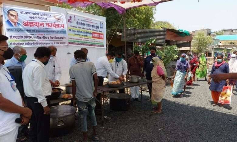 डॉ.बाबासाहेब आंबेडकर जयंती निमित्त सालाबादप्रमाणे उत्सव साजरा न करता दलित नेते रामभाऊ संदानशिव यांनी सामाजिक परिषद,मा.आ.कृषिभूषण साहेबराव पाटील व मित्र परिवाराच्या माध्यमातून अमळनेर शहरातील विविध मागास, गरीब,कष्टकरी वाडी,मोहल्ला, वस्त्यांवर सुरू असलेल्या अन्नदानाचा एक दिवसाचा खर्च करून डॉ बाबासाहेब आंबेडकर जयंती साजरी केली.डॉ बाबासाहेब आंबेडकर जयंतीनिमित्ताने अमळनेर मधिल फरशी पूल ,गांधलीपुरा परिसर येथिल नदीलगत अन्नक्षेत्र केंद्रावर तहसीलदार मिलिंद वाघ ,नगरसेवक नरेंद्र संदानशिव, सामाजिक कार्यकर्ते संतोष लोहेरे,प्रा.गणेश पवार,हमीद जनाब,प्रा.अशोक पवार,सामाजिक कार्यकर्ते रणजित शिंदे आदींच्या हस्ते अन्नदान वाटप करण्यात आले.असे एकूण १५ केंद्रांवर अन्न वाटप करण्यात आले.यावेळी नगरसेविका मायाबाई कैलास लोहेरे यांचेसहकार्य लाभले.सोशल डीस्टंसिंग, मास्क, सॅनिटायझर वापरण्याच्या नियमांचे पालन करून गरीब,गरजू लोकांना दोन वेळचे सकस जेवण १५ भोजन केंद्रांवर नियमित दिले जात आहे.