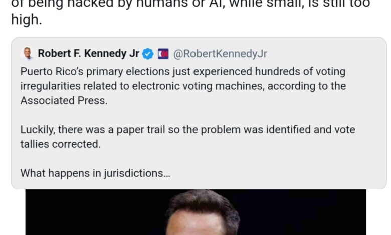 एलॉन मस्क याने अमेरिकेच्या राष्ट्राध्यक्ष पदाचे उमेदवार रॉबर्ट एफ केनडी यांच्या युनियर ही पोस्ट शेअर केली आहे. सोशल मीडिया प्लॅटफॉर्म X वर त्याने ईव्हीएम विषयी भावना व्यक्त केल्या आहेत. “इलेक्ट्रॉनिक वोटिंग मशीन नष्ट करायला हव्यात. या मशीन मानव आणि AI च्या मदतीने हॅक होण्याचा मोठा धोका आहे. हा धोका कमी आहे, पण त्याने मोठी गडबड उडते.”, असे मत त्याने पोस्टमध्ये व्यक्त केले.