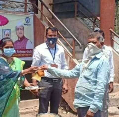 या शिवभोजन १०० थाळी मंजूर असल्याने गरजू नागरिक यांनी सोशल डिस्टन्स साधून पार्सल स्वरूपात ५ रुपयांत भोजन देण्यात आले.