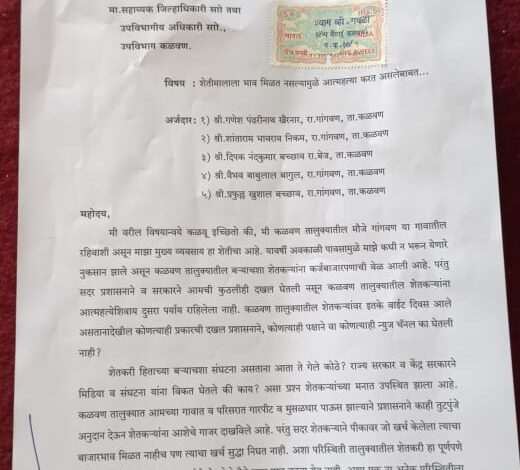कळवण येतील शेतकऱ्यांनी शेतीमालाला योग्य भाव मिळत नाही म्हणून दिला प्रांतधिकारी यांना निवेनाद्वारे आत्महत्या करण्याचा दिला इशारा