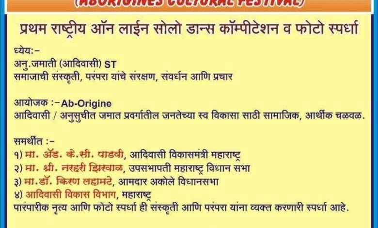 भारतातील आदिवासींची पहिली राष्ट्रीय सांस्कृतीक ऑनलाइन पारंपरिक नृत्य व फोटो स्पर्धा दि.15/ 8/2020 रोजी अनुसूचित जमातीच्या संस्कृती, परंपरा,वेशभूषा, रीतिरिवाज यांच्या संरक्षण आणि संवर्धन व प्रचार प्रसारासाठी हे धेय साधुन aborigine या समाजिक संस्थेकडून ही स्पर्धा घेण्यात येत आहे.