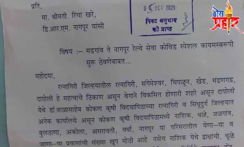 नवरात्र,दसरा,दिवाळी,होळी उत्सवानिमित्त नागपूर मडगाव कोविड सुपरफास्ट स्पेशल सुरू करण्याची माजी नगराध्यक्ष व शिवसेना शाखाप्रमुख राजेंद्र पेठकर यांनी केली डिव्हिजनल रिजनल मॅनेजर मा.श्रीमती ॠचा खरे यांच्याकडे मागणी