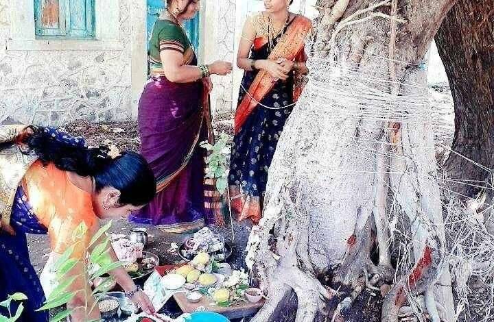 झाल्यामुळे झाडांचे सौंदर्य वाढले आहे. शुक्रवारी ज्येष्ठ पौर्णिमेनिमित्त वडाचे पूजन करण्यासाठी महिलांची गर्दी दिसून आली नाही . वडाला हळद-कंकू,विड्याची पान , सुपारी, आंबे व गव्हा- तांदळाची ओटी,दक्षिणा ठेवून महिलांनी पुजा केली. प्राचीन काळी अश्वपती राजाची कन्या सावित्रीने आपल्या आजारी पतीचे प्राण वडाच्या झाडाखाली तपश्चर्या व निसर्गोपचार करून वाचविले.यमाच्या (मृत्यूच्या)तावडीतून पतीचे प्राण परत आणले. ही घटना ज्येष्ठ पौर्णिमेदिवशी घडली. म्हणून या पौर्णिमेस वटपौर्णिमा म्हटले जाऊ लागले.