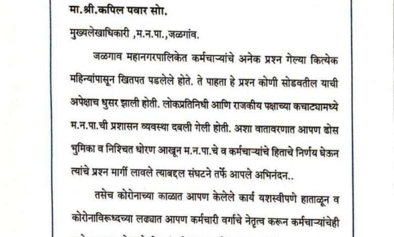 जळगाव शहीद भगतसिंग म.न.पा. कर्मचारी संघटनाने शासकीय अधिकारीचा कामाची दखल घेवून गौरव पत्र देवून आभार मानले. विनोद जाधव जळगाव जळगाव : जळगाव महानगरपालिकेत कर्मचाऱ्यांचे अनेक प्रश्नन गेल्या कित्येक महिन्यांपासून खितपत पडलेले होते. ते पाहता हे प्रश्नन कोणी सोडवतील याची अपेक्षाच धुसर झाली होती. लोकप्रतिनिधी आणि राजकीय पक्षाच्या कचाट्यामध्ये म.ना.पा.ची प्रशासन व्यवस्था दबली गेली होती.अशा वातावरणात आपण ठोस भूमिका व निश्चित धोरण आखून म.ना.पा चे व कर्मचाऱ्यांचे हितांचे निर्णय घेवून त्यांचे प्रश्नन मार्गी लावले त्या बद्दल संघटनेतर्फे आपले अभिनंदन.
