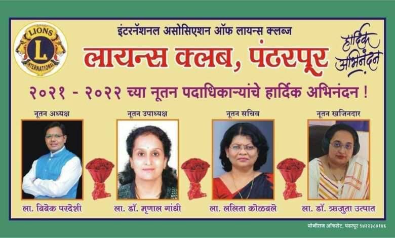 पंढरपूर : लायन्स क्लब ऑफ पंढरपूर ची २०२१-२२ ची पदाधिकारी व कार्यकारिणी निवड नुकतीच संपन्न झाली. मावळत्या अध्यक्षा ला.डॉ. सुजाता गुंडेवार यांनी ही निवड जाहीर केली.अध्यक्षपदी पंढरपूर नगरपालिकेचे नगरसेवक मा.ला.विवेक परदेशी यांची एकमताने निवड करण्यात आली. तसेच सचिव पदी अनुभवी व कार्यतत्पर अशा ला.ललिता कोळवले जाधव यांची तर खजिनदार पदी पंढरपुरातील प्रसिद्ध मनोविकारतज्ञ ला.डॉ.ऋजुता गोळवलकर उत्पात व प्रथम उपाध्यक्ष म्हणून ला.डॉ.मृणाल गांधी यांची निवड करण्यात आली. नागरिकांमधील खरी गरज शोधुन ती पूर्ण करण्याचे काम लायन्स क्लब इंटरनॅशनल या सामाजिक संस्थे व्दारा करण्यात येते.लायन्स संस्था गेली कित्येक वर्षे सामाजिक मदतकार्य करत आहे. पंढरपूर मध्ये लायन्स क्लब संचलित शहीद मेजर कुणालगिर गोसावी अंध शाळा, लायन्स क्लब पंढरपूर संचलित नेत्र रुग्णालय तसेच अंधांसाठी पोस्टल ब्रेल लायब्ररी असे कायमस्वरूपी प्रकल्प लायन्स संस्था राबवत आहे. सामाजिक कार्याची आवड मुळतः नुतर सदस्यांना आहे.लायन्स क्लब पंढरपूरच्या कार्यात खूप मोलाची भर पडणार आहे तसेच नुतन सदस्य सदर वर्षामध्ये सामाजीक कार्यामध्ये आपला ठसा उमटवतील तसेच लायन्स संस्थेचा सेवेचा वारसा नुतन सदस्य निभावतील असा विश्वास सर्व लायन्स सदस्यांनी सदर प्रसंगी व्यक्त केला. पंढरपुरातील नागरिक व विशेष पदाधिकारी यांनी तसेच लायन्स संस्थेचे डिस्ट्रिक्ट तसेच मल्टिपल पदाधिकारऱ्यानी नूतन सदस्यांचे अभिनंदन केले व शुभेच्छा दिल्या आहेत.