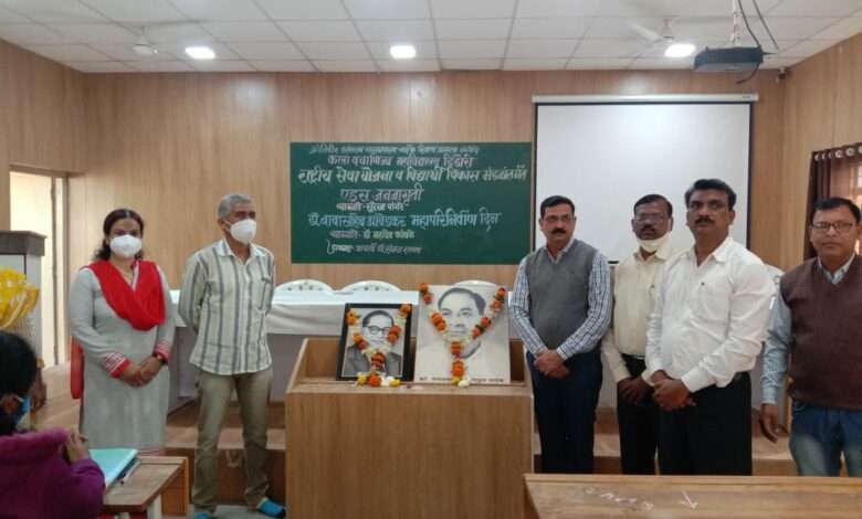 दिंडोरी:वसंतराव नारायणराव नाईक शिक्षण प्रसारक संस्थेचे कला व वाणिज्य महाविद्यालय दिंडोरी येथे विद्यार्थी विकास मंडळ व राष्ट्रीय सेवा योजना यांच्या वतीने डॉ. बाबासाहेब आंबेडकर यांच्या महापरीनिर्वाण दिनानिमित्त आदरांजली वाहण्यात आली . कार्यक्रमाच्या अध्यक्षस्थानी प्राचार्य डॉ संजय सानप होते. त्यांनी डॉ. आंबेडकरांच्या राज्यघटना निर्मितीतील योगदानाबाबत विवेचन केले व डॉ बाबासाहेब आंबेडकर यांच्या राजकीय, सामाजिक , आर्थिक व सांस्कृतिक योगदानाबद्दल माहिती दिली . या प्रसंगी मराठी विभाग प्रमुख डॉ. महादेव कांबळे यांनी आपल्या मनोगतातून डॉ. बाबासाहेब आंबेडकर यांच्या शिका संघटित व्हा आणि संघर्ष करा या या संदेशाचे महत्व विशद केले . प्रा. नाना चव्हाण, डॉ. प्रल्हाद दुधाने, प्रा पंकजा अहिरे , शिक्षक व शिक्षकेतर सेवकांनी परिश्रम घेतले . महापरिनिर्वाण दिनाच्या कार्यक्रमासाठी महाविद्यालयातील प्राध्यापक, शिक्षकेतर सेवक व विद्यार्थी उपस्थित होते. कार्यक्रम यशस्वी करण्यासाठी