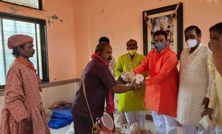 पंढरपूर शहरामध्ये लाॅकडाऊनमुळे सध्या लग्न समारंभ आणि त्या अनुसंगाने केले जाणारे जागरण गोंधळ कार्यक्रम ठप्प झाले आहेत. त्यामुळे अशा विधी आणि कार्यक्रमांवर पोट भरणारे अनेक पारंपारिक लोककलावंतावर उपासमारीची वेळ आली आहे. लग्ना झाल्यानंतर नवरदेवाच्या दारात आईंचा जागरण गोंधळ मांडून नव विवाहित दाम्पत्यांचा संसार सुखाचा व्हावा यासाठी आई तुळजाभावनीकडे मागणं कऱणारे गोंधळी समाजातील अनेक कलावंतावर कोरोनाचे सावट आहे.गेल्या दोन महिन्यांपासून जागरण गोंधळाचे कार्यक्रम बंद झाल्याने येथील गोंधळी समाजातील अनेक तरुण कलाकार अडचणीत आले आहेत. गोंधळी समाजातील गरीब व गरजू कलाकारांना आज मनसेचे प्रदेश सरचिटणीस दिलीप धोत्रे यांनी अन्नधान्यासह जीवनावश्यक वस्तूंचे वाटप केले.कोरोनाचा प्रादुर्भाव रोखण्यासाठी दोन महिन्यांपासून लाॅकडाऊन आहे. या दरम्यान अनेक कार्यक्रम रद्द झाले आहेत. लग्न समारंभ व त्या अनुसंगाने होणारे जागरण गोंधळ, देवपूजा असे घरगुती कार्यक्रम ही रद्द झाले आहेत.