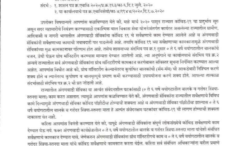 अंगणवाडी सेविकांना कोविड-19 विषाणू सर्वेक्षणच्या कामातून वगळण्याची मागणी महिला व बालविकास मंत्री ॲड.यशोमती ठाकूर यांनी मान्य केली असून त्यानुसार सर्व जिल्हाधिकारी आणि महानगरपालिकांना निर्देश देण्यात आले आहेत.