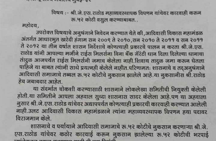 जे.एस.राठोड यांच्यावर कारवाईसाठी आमदार धूर्वे यांचे मुख्यमंत्र्यांना पत्र आदिवासी विकास विभागात 52 कोटी रूपयांचा भ्रष्टाचार