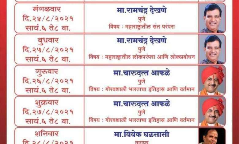 (दि.२८व२९)विवेक घळसासी-नागपूर( सकारात्मकते ची लस) तर दुस-या दिवशी (छत्रपती शिवराय काळाच्या पुढचे नेतृत्व)या विषयाने व्याख्यानमालेचा समारोप होईल.
