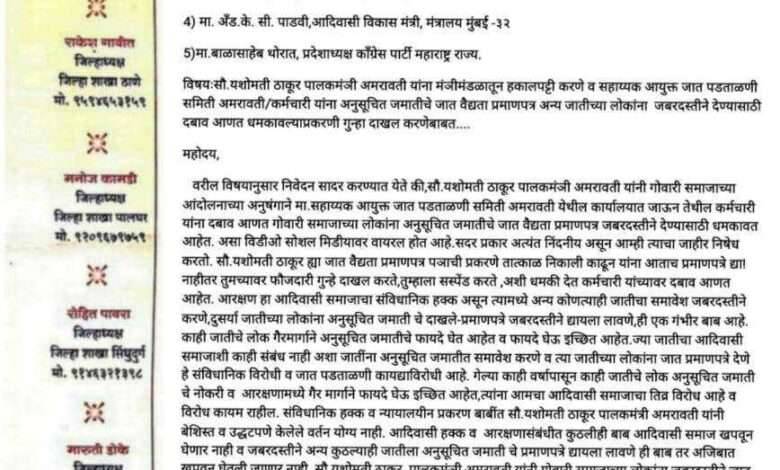 निवेदनात म्हटले आहे की, श्रीम.यशोमती ठाकूर पालकमंञी अमरावती यांनी गोवारी समाजाच्या आंदोलनाच्या अनुषंगाने मा.सहाय्यक आयुक्त जात पडताळणी समिती अमरावती येथील कार्यालयात जाऊन तेथील कर्मचारी यांना दबाव आणत गोवारी समाजाच्या लोकांना अनुसूचित जमातीचे जात वैद्यता प्रमाणपत्र जबरदस्तीने देण्यासाठी धमकावत आहेत. असा विडीओ सोशल मिडीयावर वायरल होत आहे.सदर प्रकार अत्यंत निंदनीय असून आम्ही त्याचा जाहीर निषेध करतो. श्रीम .यशोमती ठाकूर ह्या जात वैद्यता प्रमाणपत्र पञाची प्रकरणे तात्काळ निकाली काढून यांना आताच प्रमाणपत्रे द्या! नाहीतर तुमच्यावर फौजदारी गुन्हे दाखल करते,तुम्हाला सस्पेंड करते ,अशी धमकी देत कर्मचारी यांच्यावर दबाव आणत आहेत. आरक्षण हा आदिवासी समाजाचा संविधानिक हक्क असून त्यामध्ये अन्य कोणत्याही जातीचा समावेश जबरदस्तीने करणे,दुसर्या जातीच्या लोकांना अनुसूचित जमाती चे दाखले-प्रमाणपत्रे जबरदस्तीने द्यायला लावणे,ही एक गंभीर बाब आहे. काही जातीचे लोक गैरमार्गाने अनुसूचित जमातीचे फायदे घेत आहेत व फायदे घेऊ इच्छित आहेत.ज्या जातीचा आदिवासी समाजाशी काही संबंध नाही अशा जातींना अनुसूचित जमातीत समावेश करणे व त्या जातीच्या लोकांना जात प्रमाणपत्रे देणे हे संविधानिक विरोधी व जात पडताळणी कायद्याविरोधी आहे. गेल्या काही वर्षापासून काही जातीचे लोक अनुसूचित जमाती चे नोकरी व आरक्षणामध्ये गैर मार्गाने फायदे घेऊ इच्छित आहेत,त्यांना आमचा आदिवासी समाजाचा तिव्र विरोध आहे व विरोध कायम राहील. संविधानिक हक्क व न्यायालयीन प्रकरण बाबींत श्रीम.यशोमती ठाकूर पालकमंत्री अमरावती यांनी बेशिस्त व उद्धटपणे केलेले वर्तन योग्य नाही. आदिवासी हक्क व आरक्षणासंबंधीत कुठलीही बाब आदिवासी समाज खपवून घेणार नाही व जबरदस्तीने अन्य कुठल्याही जातीला अनुसूचित जमाती चे प्रमाणपत्रे द्यायला लावणे ही बाब तर अजिबात खपवून घेतली जाणार नाही. श्रीम .यशोमती ठाकूर पालकमंञी अमरावती यांनी गोवारी समाजाच्या लोकांना जबरदस्तीने जात वैद्यता प्रमाणपत्र द्यायला लावण्यासाठी सहाय्यक आयुक्त जात पडताळणी समिती अमरावती येथील कार्यालयात जाऊन तेथील कर्मचारी यांना दबाव टाकत जातीचे प्रमाणपत्र दिले नाही तर तुम्हाला सस्पेंड करते,तुमच्या वर फौजदारी गुन्हे दाखल करते अशा पद्धतीने धमकावले आहे.सदर गैरकृत्य पालकमंञी पदाच्या व्यक्तीस अशोभनीय आहे.म्हणून श्रीम .यशोमती ठाकूर यांना तात्काळ मंञीमंडळातून काढून टाका व कर्मचारी यांना धमकावल्याप्रकरणी फौजदारी गुन्हा दाखल करा.व सहाय्यक आयुक्त जात पडताळणी समिती अमरावती येथील कर्मचारी यांना योग्य ते संरक्षण द्या हीच नम्र विनंती.