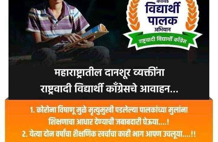 नाशिक :- राष्ट्रवादी विद्यार्थी काँग्रेसचे प्रदेशाध्यक्ष सुनिल गव्हाणे यांच्या संकल्पनेतून राष्ट्रवादी विद्यार्थी काँग्रेस, महाराष्ट्र प्रदेशच्या वतीने पूर्ण राज्यभर कोविड विद्यार्थी-पालक अभियान सुरू करण्यात आले आहे. या अभियानाच्या माध्यमातून ज्या विद्यार्थ्यांचे पालक करोना विषाणूला बळी पडले आणि दुर्दैवाने त्यांना या जगाचा निरोप घ्यावा लागला अशा पालकांच्या पाल्यांच्या शिक्षणाच्या एकूण खर्चाच्या काही खर्चाची जबाबदारी समाजातील दानशूर व्यक्तींनी घ्यावी असे आवाहन या अभियानाच्या माध्यमातून करण्यात येणार आहे.
