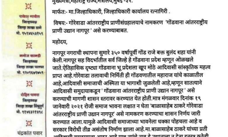 निवेदनात म्हटले आहे की, नागपूर नगराची स्थापना सुमारे ३५० वर्षापूर्वी गोंड राजे बक्त बुलंद शहा यांनी केली.नागपूर सह विदर्भातील सर्व जिल्हे हे गोंडवाना प्रदेश म्हणून ओळखले जाते.ऐतिहासिक दृष्ट्या गोंडवाना भू प्रदेशला खूप मोठे आदिवासी सांस्कृतिक महत्व प्राप्त आहे.गोरेवाडा तलावाची निर्मिती ही गोंडवणातील महाराज यांचे काळातील आहे,आदिवासी समाजाची अस्मिता या भागाशी जुळलेली आहे,म्हणून सातत्याने आदिवासी समुदायाकडून ‘ गोंडवाना आंतरराष्ट्रीय प्राणी उद्यान नागपूर ‘ असे करण्याची मागणी शासन स्तरावर करण्यात येत होती.मात्र मंगळवार दिनांक १९ जानेवारी २०२१ रोजी समाज भावना लक्षात न घेता ‘बाळासाहेब ठाकरे गोरेवाडा आंतरराष्ट्रीय प्राणी उद्यान नागपूर’ असे नामकरण करण्याचा शासन निर्णय जारी करण्यात आला.यामुळे आदिवासी समाजाच्या भावनेला धक्का पोहचला आहे व सरकार विरोधी तीव्र असंतोष निर्माण झाला आहे.मा.बाळासाहेब ठाकरे यांच्या प्रती आदिवासी समुदायाला आदर आहे मात्र त्यांचे नाव हे उद्यानाला न देता इतरत्र कुठेही दिल्यास आदिवासी समुदायाला हरकत नाही त्याचे आम्ही स्वागत करू मात्र आदिवासी समुदायाची अस्मिता,संस्कृती जुळलेल्या गोरेवाडा आंतरराष्ट्रीय प्राणी उद्यानाला ‘गोंडवाना आंतरराष्ट्रीय प्राणी उद्यान नागपूर ‘ असे करण्यात यावे अशी समाजाच्या वतीने मागणी करण्यात येत आहे. मागणी पूर्ण न झाल्यास समाजाच्या वतीने आंदोलन छेडण्यात येईल.