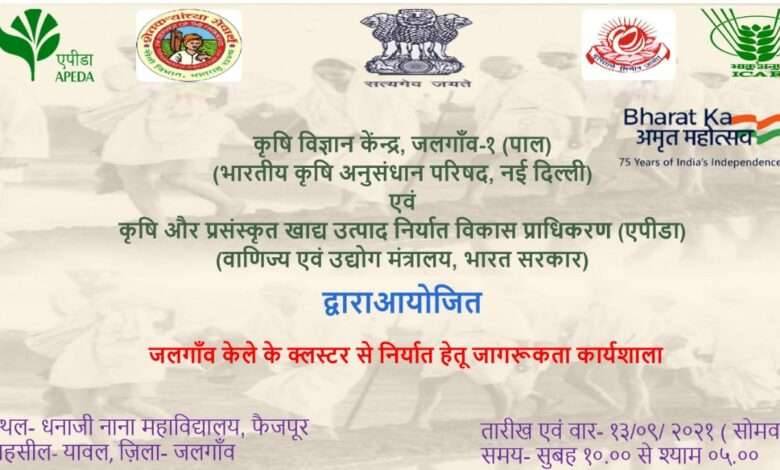 फैजपूर : कृषी विज्ञान केंद्र,पाल व कृषी विभाग,जळगांव आणि अपेडा (ऍग्रीकल्चर प्रोसिड फूड अँड एक्स्पोर्ट डेवलोपमेंट औथोरिटी ऑफ इंडिया) या संस्थेच्या वतीने दिनांक 13 सप्टेंबर 2021 रोजी धनाजी नाना महाविद्यालय,फैजपूर येथे एक दिवसीय निर्यातक्षम केळी उत्पादन या विषयावर कार्यशाळेचे आयोजन करण्यात आले आहे. या कार्यक्रमास उद्घाटक म्हणून माननीय श्री.शिरीषदादा चौधरी(आमदार,रावेर/यावल) यांची उपस्थिती राहणार आहे. तसेच तांत्रिक चर्चासत्रात डॉ. सी डी बडगुजर (प्रमुख शास्त्रज्ञ केळी संशोधन केंद्र जळगाव) डॉ.के बी पाटील (केळी तज्ञ व उपाध्यक्ष जैन इरिगेशन सिस्टिम जळगाव) मा. श्री लोकेश गौतम (नोडल ऑफिसर,अपेडा मुंबई) श्री किरण जाधव (शास्त्रज्ञ कृषी विज्ञान केंद्र ममुराबाद जळगाव) मा.श्री अजहर पठाण (केळी निर्यातदार रिलायन्स कंपनी मुंबई)हे मार्गदर्शक उपलब्ध राहणार आहे. एक जिल्हा एक उत्पादन या योजनेअंतर्गत जिल्ह्यातील शेतकऱ्यांच्या मार्फत निर्यातक्षम केळी उत्पादन वाढावे यासाठी शासनाच्या वतीने प्रयत्न केले जात आहे पाल येथील कृषी विज्ञान केंद्राच्या माध्यमातून व अपेडा या संस्थेच्या सहकार्याने जळगाव जिल्ह्यातून निर्यातक्षम केळी उत्पादन होण्यासाठी अशा प्रकारच्या कार्यक्रमाचे आयोजन करण्यात आले आहे तरी पंचक्रोशीतील व जिल्ह्यातील केळी उत्पादक शेतकऱ्यांनी या कार्यशाळेत उपस्थित राहून लाभ घ्यावा असे आवाहन कृषी विज्ञान केंद्राचे प्रभारी प्रमुख व वरिष्ठ शास्त्रज्ञ प्रा. महेश महाजन यांनी केले आहे.