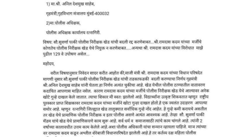 निवेदनात म्हटले आहे की, माजी मंत्री श्री. रामदास कदम यांच्या विधान परिषदेत मागणी नूसार सौ.सुवर्णा पत्की पोलीस निरीक्षक खेड यांची तडकाफडकी बदली करण्याचा निर्णय गृहमंत्री श्री.अनिल देशमुख साहेब यांनी घेतला.हा निर्णय अत्यंत चुकीचा आहे. खेड येथील पोलीस ठाण्यातील वातावरण आपणास माहित नसेल. कारण रामदास कदम यांच्या मर्जीचे पोलीस निरीक्षक खेड येथे आल्यावर अनेक खोटे गुन्हे दाखल केले जातात. त्याचा शिकार मी स्वतः झालेलो आहे. विद्यार्थ्यांना उत्कृष्ट शिकवतात म्हणून राष्ट्रीय पुरस्कार प्राप्त शिक्षकावर रामदास कदम यांच्या मर्जीने खोटा गुन्हा दाखल होतो.हे एक ज्वलंत उदाहरण आपल्या समोर आहे. म्हणून रत्नागिरी जिल्ह्यात खेड तालुक्यात सर्वाधिक गुन्हे नोंद आहेत. हे गुन्हे कमी करायचे असतील तर खेड येथे प्रामाणिक पोलीस निरीक्षक व इतर पोलीस असणे अत्यंत आवश्यक आहे. तेव्हा सौ. सुवर्णा पत्की मॅडम यांचे खेड येथे प्रामाणिकपणे काम सुरू आहे. सर्व धर्म व समाजासाठी त्यांचे काम चांगले आहे. त्यांनी 2 वर्षाच्या कालावधीत उत्तम काम केलेले आहे.अशा पोलीस अधिकारी यांचा सन्मान व्हायला पाहिजे. माञ त्यांच्या वर रामदास कदम कडून अश्लील शेरेबाजी विधानपरिषदेत झालेली आहे.हे तर कर्तव्य दक्ष महिला पोलीस अधिकारी यांचा अपमानास्पद आहे.