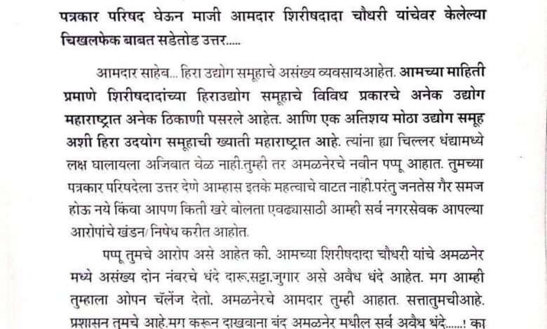 यात राजू फाफोरेकर यांचा धुळे रोडवर मोठा पत्त्यांचा जुगार अड्डा आहे. राष्ट्रवादी काँग्रेसचे शहर उपाध्यक्ष संजय भिला पाटील यांचा पायल हॉटेलच्या मागे जुगार अड्डा आहे. पैलाड नाका परिसरातील बापू टेलर व त्यांचे भाऊ मटका किंग व मटका बुकी आहेत. न्हानूभाऊ पाटील हे मटका बुकी आहेत. नगाव येथील मनोहर पाटील हे मटका बुकी आहेत. असे मटका बुकी, जुगार माफिया व रेती तस्कर असणारी ही मंडळी आहे. ही सर्व सर्वसामान्य, कष्टकरी जनतेस लुटणारी गॅँग आहे. तर आमदारांचा भागीदार सडावण येथील विजू साळुंखे, बाळू पाटील, भटू पाटील, आमदारांचा भाऊ शुभम पाटील, आरिफ खाटीक, मेवाती हे सर्व रेती तस्कर आहेत.सरार्स अवैध वाळू उपसा करत दिवसरात्र वाहतूक केली जाते. ही मंडळी शासनाचा महसूल बुडवत रेती उत्खन्नन करून ट्रॅक्टर, डंपरने वाहतूक करतात. तसेच आमदारांच्या नावाने त्यांच्या बॉडीगार्डनेही मोठा अवैध वाळू उपसा करण्याचा सापटा चालविला आहे. आमदारांनी संबंधितांचे हे धंदे बंद करून दाखवावेत जनतेची व शासनाची लूट थांबवावी. तसे केले नाही तर आमदारांची भागीदारी आहे अथवा त्यांना हप्ते मिळतात हे सिद्ध होईल, असे पत्रकात नमूद केले होते. या प्रसिद्धी पत्रकावर आमदार शिरिषदादा चौधरी मित्र परिवारातील सदस्यांच्या स्वाक्षर्या होत्या.हे आव्हान पद सिद्ध आमदारांना पेलता आले नाही. त्यांनी स्विकारले नाही अथवा त्याचे खंडणही केले नाही यामुळे तालुक्यात न उलटसुलट चर्चांना ऊत आला आहे. जनतेमध्ये याविषयी संभ्रम निर्माण झाला असून तो दूर करावा. अशी मागणी केली जात आहे.जनता हुशार आहे योग्य आणि अयोग्य ची जाणीव होत आहे किंवा झाली आहे या अनुषंगाने अनेक ठिकाणी सामान्य जनतेत ही अवैध धंद्यांची चर्चा रंगली आहे.पोलीस महसूल प्रशासन कोणतीही कार्यवाही ह्या आमदारांच्या अवैध धंदे करणाऱ्या कार्यकर्त्यांवर का करत नाही असाही प्रश्न उपस्थित केला जात आहे. मांजराला नेहमी वाटत की आपण डोळे मिटून दूध पित आहोत आपल्याला कोणी पाहणार नाही पण मांजर सोडून सर्वांनाच हे माहीत असत की दूध कोण पीत आहे.लोकांमध्ये अनेक प्रकारच्या चर्चा सुरू असून तोडीपाणी,मांडवली झाली काय? फक्त बोलण्या पुरतेच आवाहन होते काय?ते “दादा” मंडळींना घाबरले काय? ताकद कमी पडली काय? इथून तर फक्त राजकीय स्टंट होता का? प्रसिद्धी मिळविण्यासाठी पत्रकार परिषदेत हा मुद्दा घेतला का? स्वतः पद सिद्ध आमदार रेमीडिसिव्हियर इंजेक्शन उपलब्ध करू शकले नाहीत म्हणून पोट दुखलं काय? इथं पर्यंत चर्चेला उधाण आले आहे. आता सुज्ञ आमदारांनी यावर जरूर उत्तर द्यावे तेही अगदी रितसर हं..!उगीच उलट्या कोलांट्या उड्या नकोत..असे ही जनतेने मत व्यक्त केले आहे.