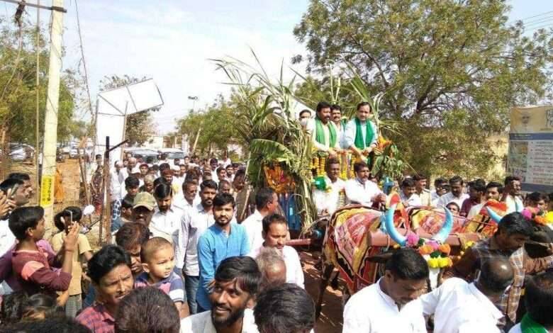 यावेळी शेतकरी मुस्तापुर येथील दयानंद पाटील यांच्या शेतात वास्तव्यास आहेत पहिले धनुर के येथे त्याचे बैलगाडीतून भव्य मिरवणूक व पुढे महिला मंगलकलश घेऊन तसेच ढोल नगारेच्या गजरात काढण्यात आली.
