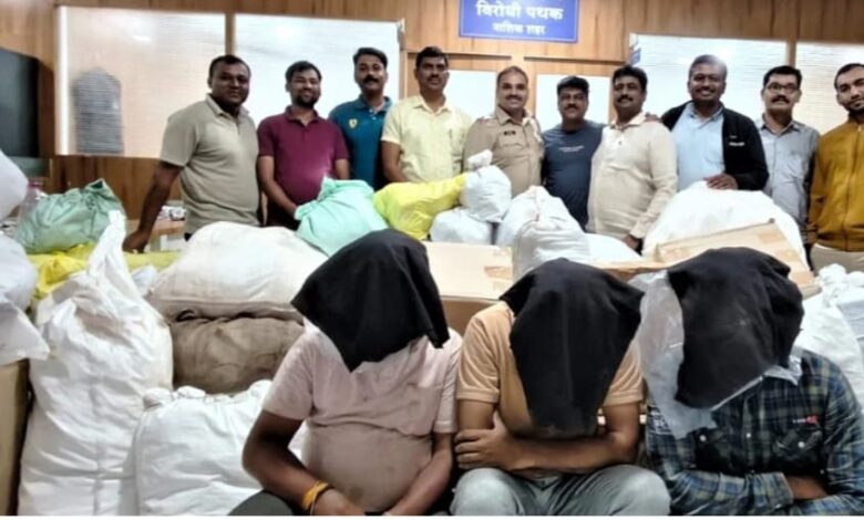 नाशिक-: शहर-ग्रामीण पोलिसांकडून सातत्याने प्रतिबंधित पानमसाला आणि गुटख्याविरोधात कारवाई केली जात असतानाही शहरात चोरीछुप्या प्रतिबंधित गुटख्याची सर्रासपणे विक्रीसाठी साठा केला जातो आहे.यासंदर्भात पंचवटीतील कुमावतनगरमधील एका गोदामावर अंमली पदार्थ विरोधी पथकाने छापा मारून सुमारे साडेसात लाखांची प्रतिबंधित गुटख्याचा साठा जप्त केला आहे. तसेच, तिघा संशयितांना जेरबंद केले आहे.रवींद्र जगन्नाथ ब्राह्मणकर उर्फ रवी (४२, रा. मोरया अपार्टमेंट, मखमलाबाद रोड) या मुख्य संशयितासह विकास वाल्मिन भारस्कर (३३, रा. देव अमृत सोसायटी, मधुबन कॉलनी, मखमलाबाद नाका), सचिन रमेश कोठावदे (३८, रा. विघ्नहर्ता रो हाऊस, पेठरोड) अशी संशयितांची नावे आहेत.शहर पोलिस आयुक्तालयाच्या अंमली पदार्थ विरोधी पथकाने शनिवारी मध्यरात्री सुगंधित पानमसाला व तंबाखू असलेल्या कुमावत नगरमधील गोदामावर छापा मारला. शहराच्या विविध भागात संशयित ब्राह्मणकर हा मोठ्या प्रमाणात प्रतिबंधित गुटख्याची विक्री करीत असल्याची खबर अंमल पदार्थविरोधी पथकाला मिळाली होती.त्यानुसार पथकाचे वरिष्ठ निरीक्षक दिवाणसिंग वसावे यांनी सापळा रचण्याचे आदेश देत, सहायक निरीक्षक हेमंत नागरे, सहाय्यक उपनिरीक्षक रंजन बेंडाळे, अंमलदार देवकिसन गायक, संजय ताजणे, गणेश भामरे,बळवंत कोल्हे, नितीन भालेराव, रवींद्र दिघे, अनिरुद्ध येवले, बाळासाहेब नांद्रे, चंद्रकांत बागडे, योगेश सानप, गणेश वडजे, अविनाश फुलपगारे आणि महिला अंमलदार अर्चना भड यांनी रात्री परिसरात तळ ठोकत कारवाई केली. याप्रकरणी तिघा संशतियांविरोधात पंचवटी पोलिसांत अन्न सुरक्षा व मानके कायद्यान्वये गुन्हा दाखल करण्यात आहे.संशयित ब्राह्मणकर,भारस्कर यांच्याकडून ६ लाख २७ हजार ८२२ रूपयांचा तर संशयित कोठावदे याच्या ताब्यातून १ लाख १७ हजारांचा असा ७ लाख ४४ हजार ९३२ रुपयांचा प्रतिबंधित गुटखा जप्त करण्यात आला आहे.
