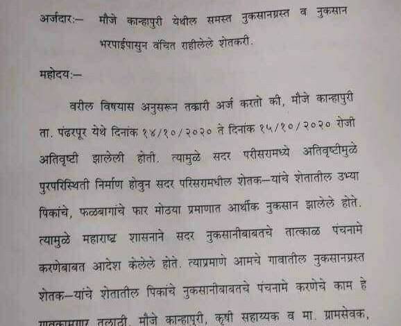 शेतकऱ्यांच्या पिकांच्या नुकसानीचे पंचनामे करण्याचे काम कृषी विभागाकडे असते. कृषी विभागात कर्मचाऱ्यांची संख्या कमी असल्यामुळे कान्हापुरी येथील ग्रामसेवक जाधव यांच्याकडे हे काम देण्यात आले होते जाधव यांनी कोतवालाच्या घरी बसून बोगस पंचनामे केल्याची तक्रार ग्रामस्थांनी केली आहे अनेक शेतकऱ्यांना मदतीपासून वंचित राहावे लागले आहे. कोतवाल कुंडलिक शिंदे यांच्या कुटुंबियांच्या नावे बोगस पंचनामे करून शासकीय अनुदान हडपण्याचा प्रकार घडला आहे