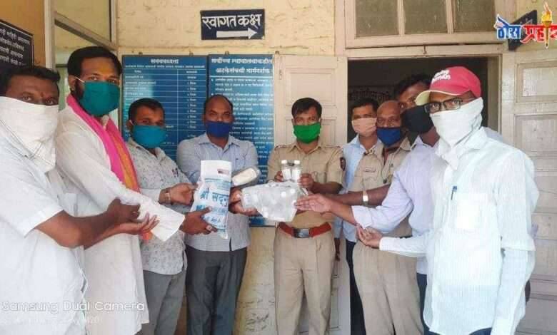 व . सुभाष पुकळे यांचे वतीने मास्क व सॅनिटाईसर चे वाटप करण्यात आले . त्यावेळी आटपाडी पोलिस स्टेशन चे ए. पी. आय मा.गबाले साहेब व मा. पाटील साहेब यांचेकडून मास्क व सॅनिटाईसर सुपूर्द करण्यात आले.
