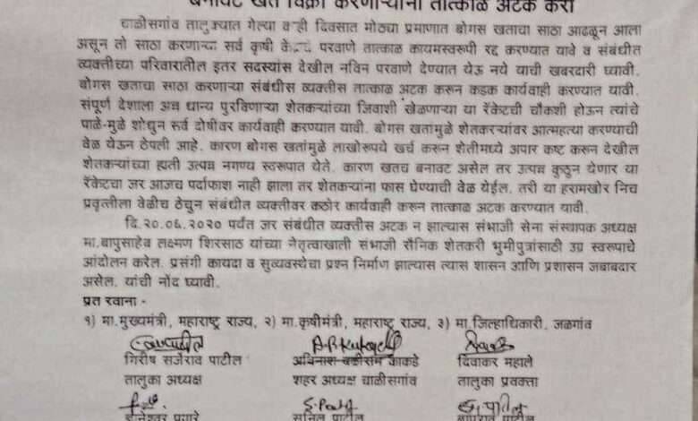 बनावट खत विक्री करणार्यांना ८ दिवसाच्या आत तात्काळ अटक करा अटक न झाल्यास संभाजी सेना वतीने उग्र स्वरूपाचे आंदोलन छेडले जाईल अश्या आशयाचे निवेदन तालुका कृषी अधिकारी पंचायत समिती तसेच चाळीसगाव पोलीस स्टेशन यांना देऊन मागणी करण्यात आली.
