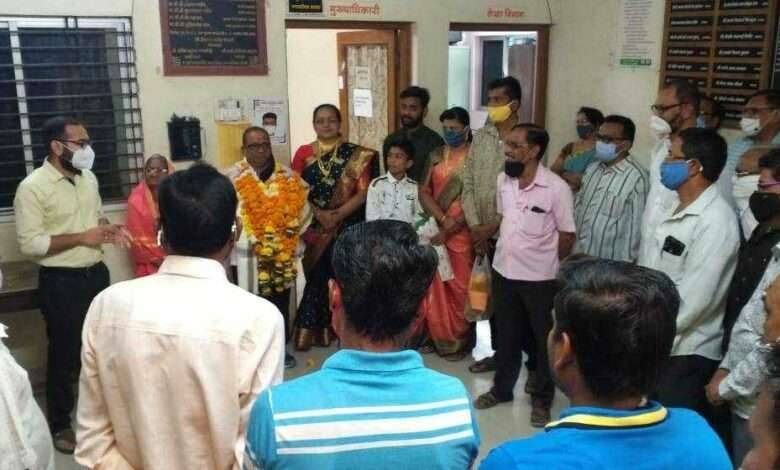 सूत्रसंचालन व प्रास्ताविक किरण चौधरी यांनी केले. सोशल डिस्टन्स व शासन नियमानुसार सोहळा संपन्न झाला. त्यानंतर पाटील यांना वाजतगाजत त्यांच्या निवासी क्रांती चौक येथे पोहचते केले.